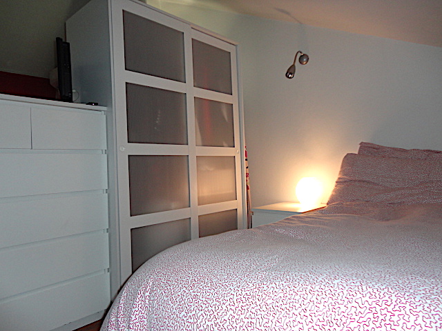 L'abitazione è un open space con il soffitto mansardato in cui la zona giorno e la zona notte sono ripartite da armadi bianchi.
